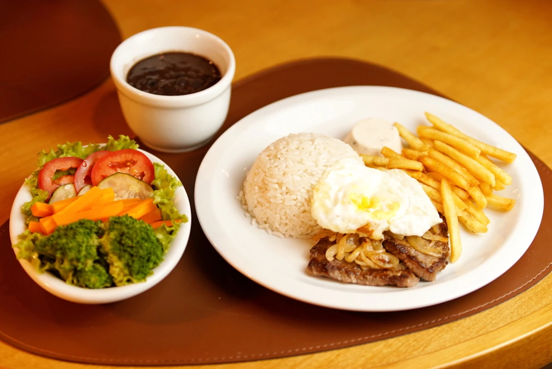 Bife de miolo de alcatra em tiras, aipim frito,laranja, arroz, revirado de feijão, bacon, ovo frito e salada