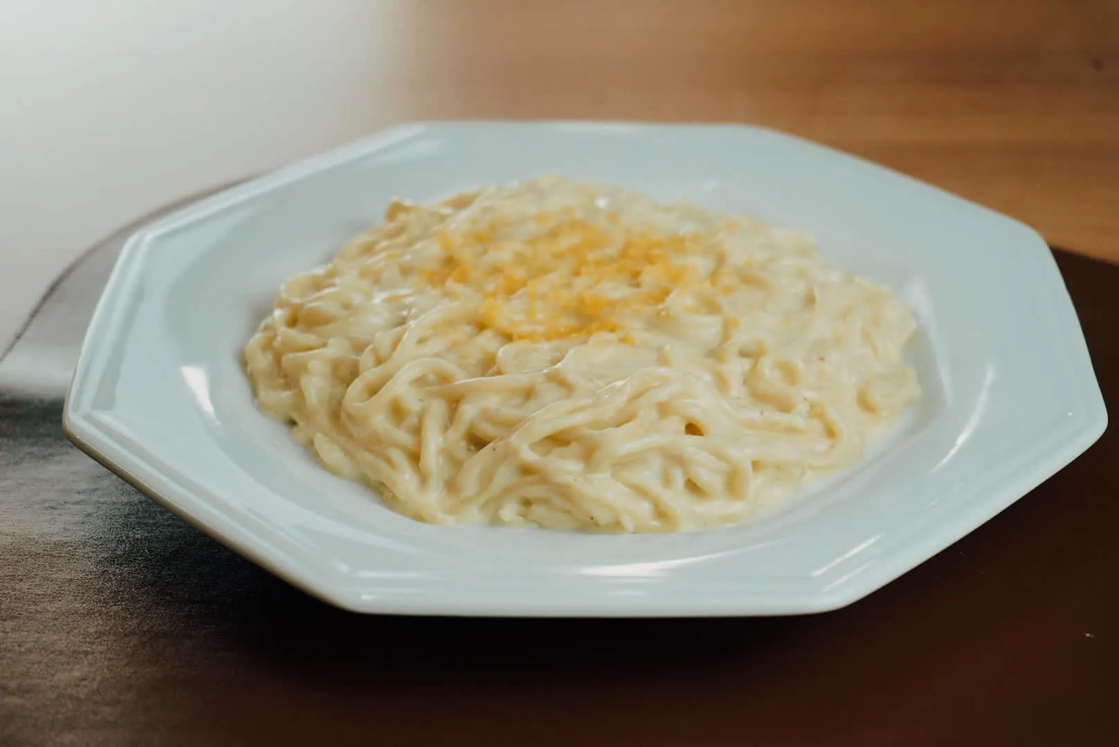 Talharim caseiro, molho bechamel, bacon, gema de ovo, parmesão ralado